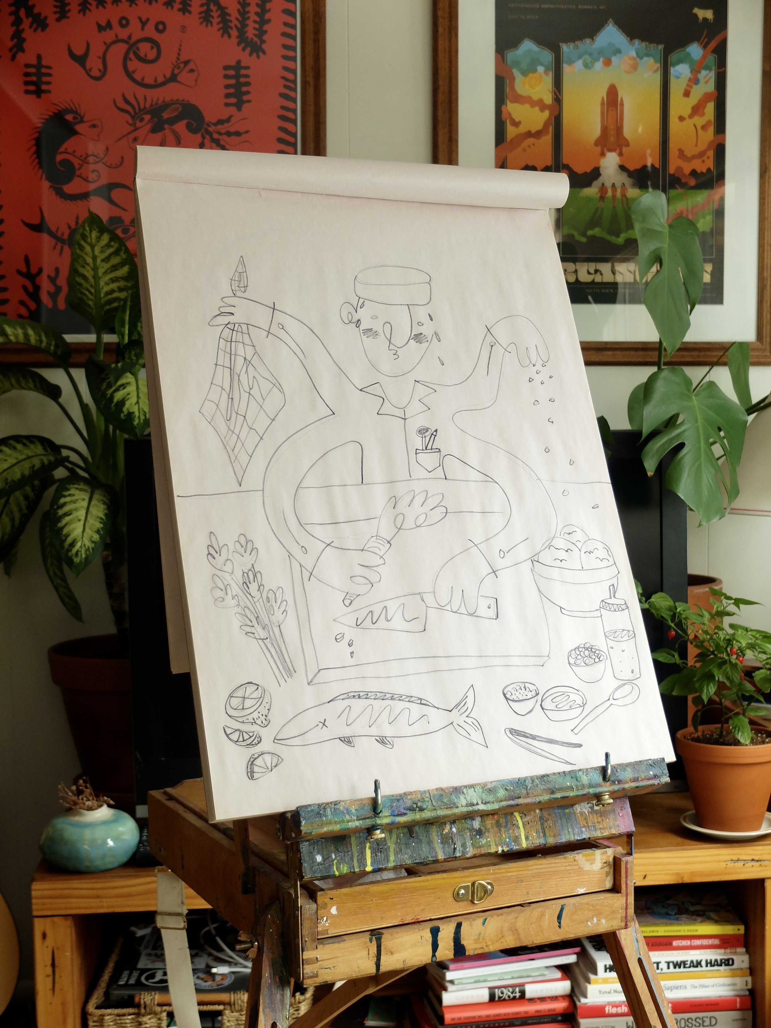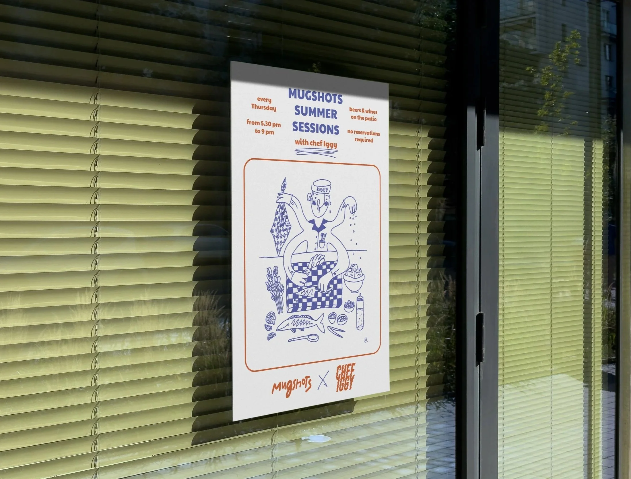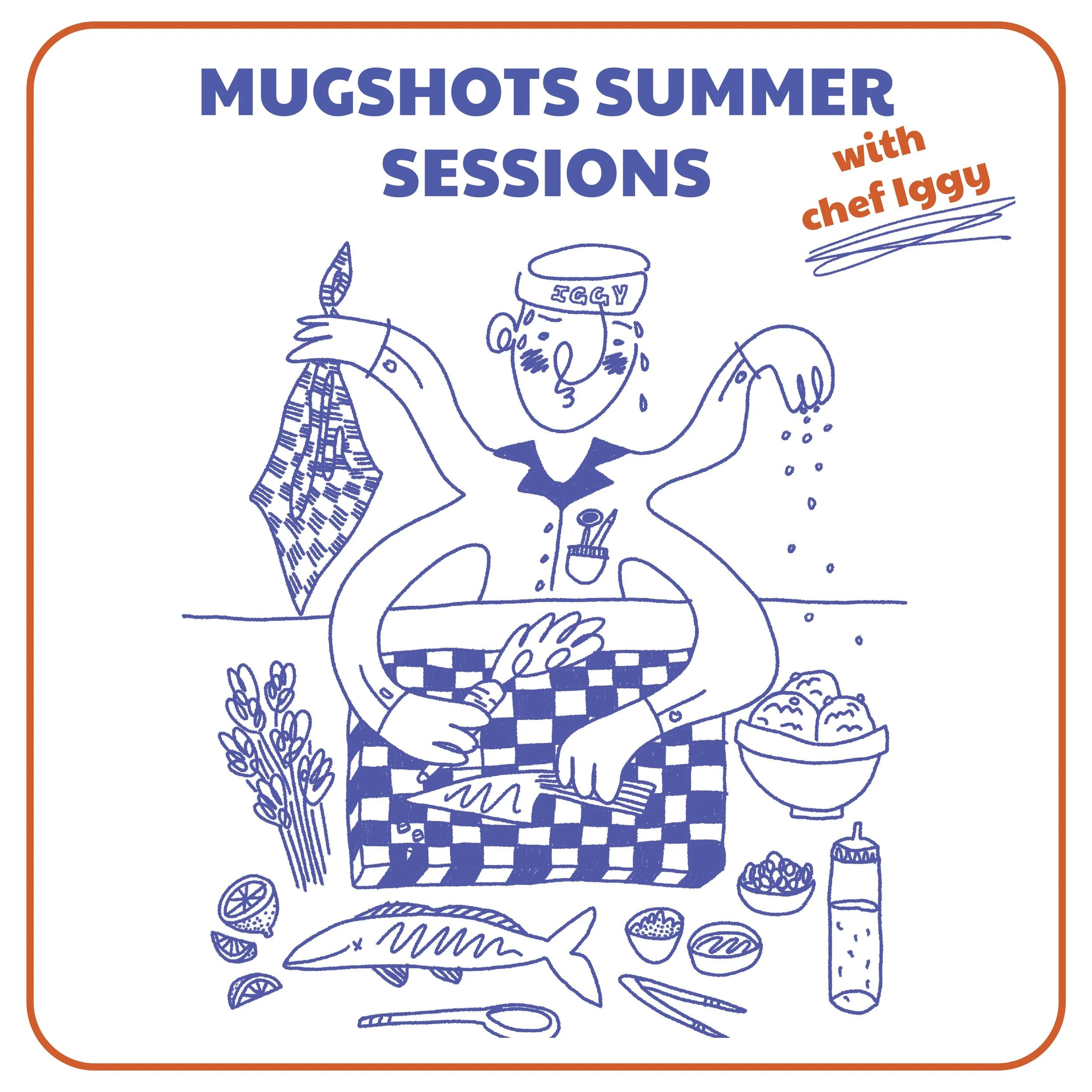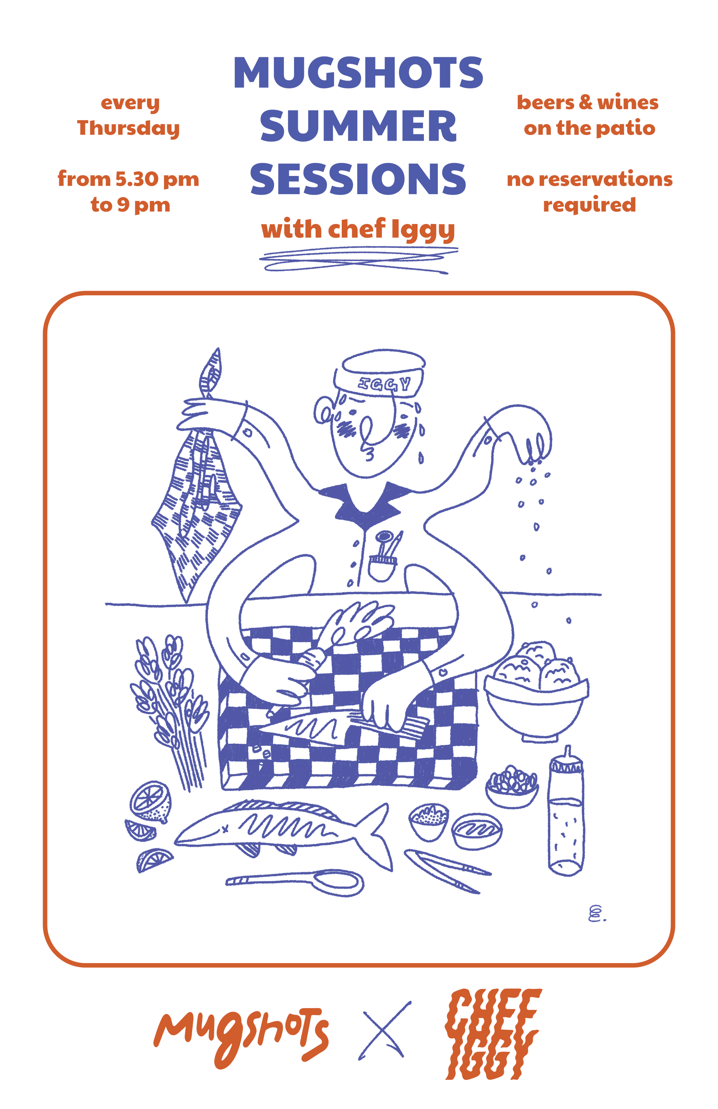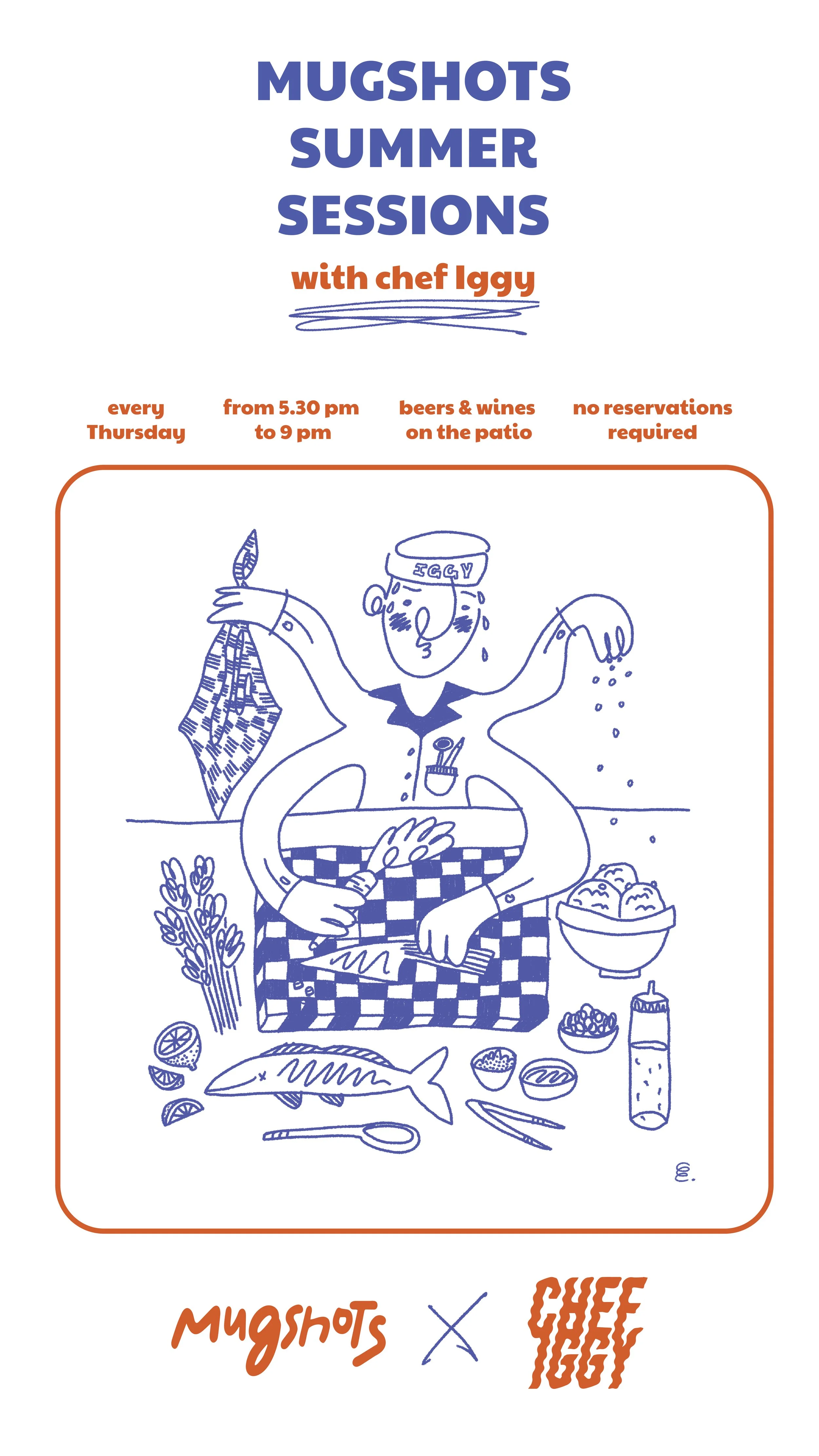 This poster was designed for a weekly summer dinner series in 2024, a collaboration between Chef Iggy and Mugshots Café. I illustrated a playful, cartoon-style version of Chef Iggy mid-motion, capturing his from-scratch, ingredient-driven and dedicated style of cooking. The animated, comical style reflects the laid-back summer vibe of the event while nodding to the to the fact that everything during these dinners was a product of his own hands. Paired with editorial design that keeps the information clear and inviting, the poster celebrates good food, good company, and a chef who really loves what he does.
